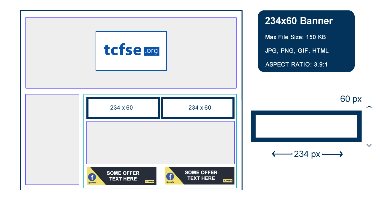 The 234x60 banner is a small rectangular banner which is 234 pixels wide and 60 pixels tall and is known as a half rectangle banner. It can be placed above content, in-content to break up editorial or after content. It can also appear in the footer of a web page. Clicking the banner usually transports the visitor to a special offer or specific information within the website or on an external website.